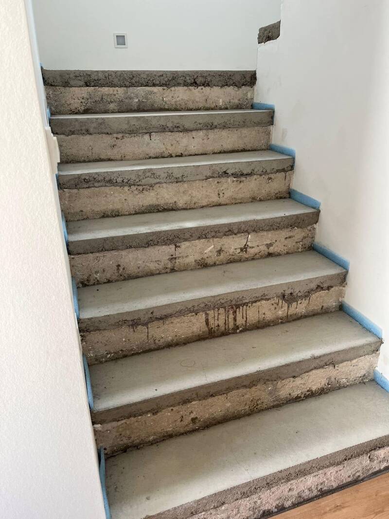 Recouvrement d un escalier en béton par du mortex gris clair . Marches , contre marches plis le limon .